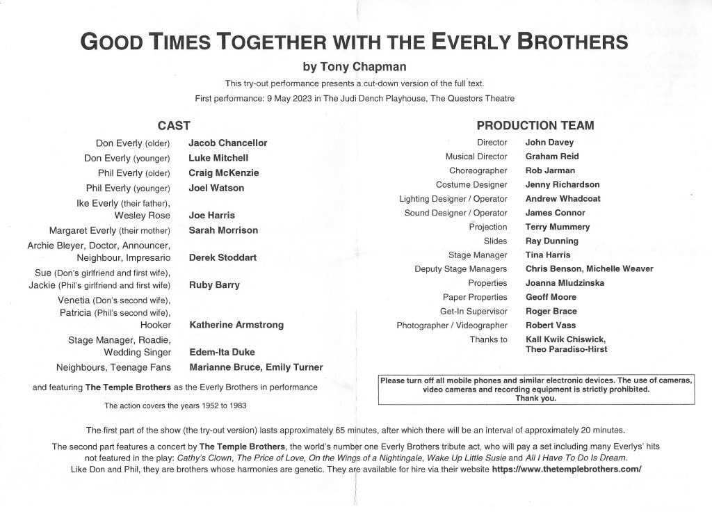 The try-out of my last musical Good Times Together with The Everly Brothers was by no means a flop – two extremely good and appreciative audiences at the Questors Theatre in Ealing, including Sir Tim Rice, Bill Kenwright, Albert Lee, Ben Goddard, Simon Meadon, Jon Woodley, Julian Littman and other luminaries include Peter Asher and Ken & Barbara Follett. For the ailing Bill it was his first excursion in six months and he loved it – he came up to me after the show, put a big arm round me and said, ‘We need to talk about this.’ Unfortunately we never did as, within weeks, his cancer had won the battle. As for the others, they were all waiting to take their lead from Tim, who in the end decided, ‘I can’t see a way to get involved with such big projects at this stage of my life. If I were 40, maybe!’ But he concluded, ‘I’m always happy to have a chat and would be delighted to attend any workshop you may be able to arrange.